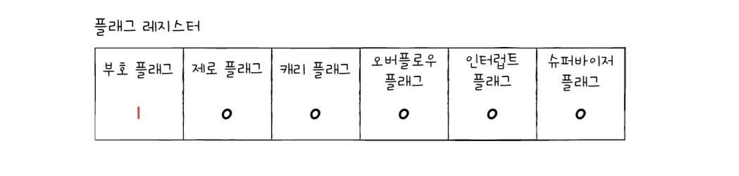 | 부호 플래그 | 연산한 결과의 부호를 나타낸다 | 부호 플래그 1 : 계산 결과는 음수 부호 플래그 0 : 계산 결과는 양수 |