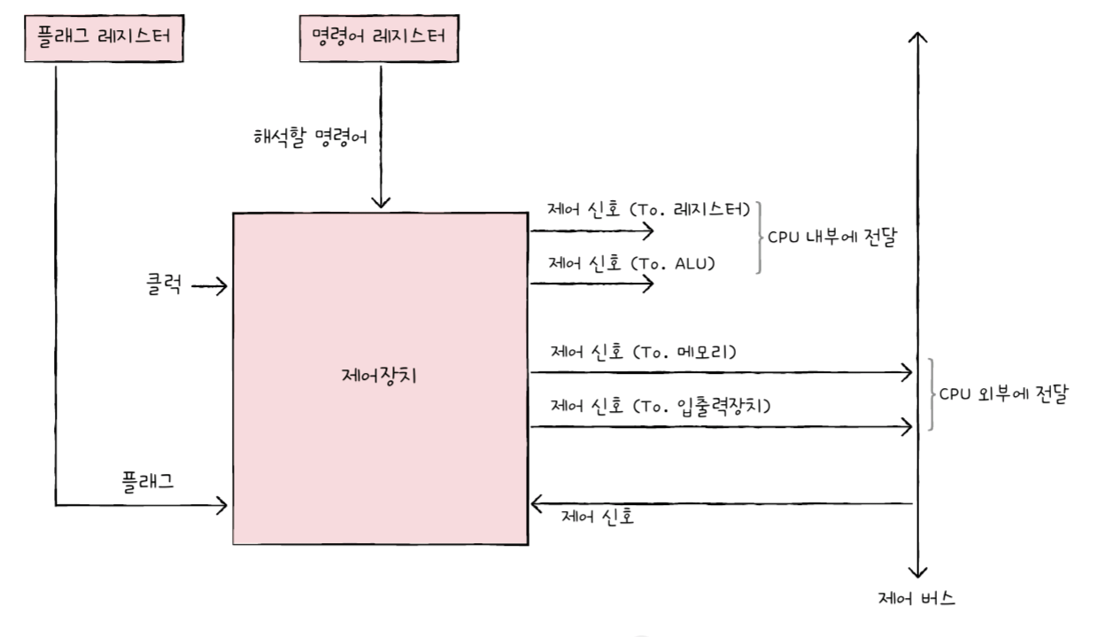 제어장치는 이 명령어 레지스터로부터 해석할 명령어를 받아들이고 해석한 뒤, 제어 신호를 발생시켜 컴퓨터 부품들에 수행해야 할 내용을 알려줍니다.