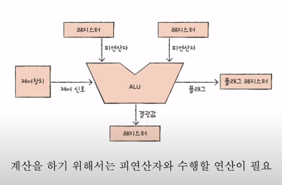 - ALU는 레지스터와 제어장치로부터 받아들인 피연산자와 제어 신호로 산술연산, 논리 연산 등 다양한 연산을 수행